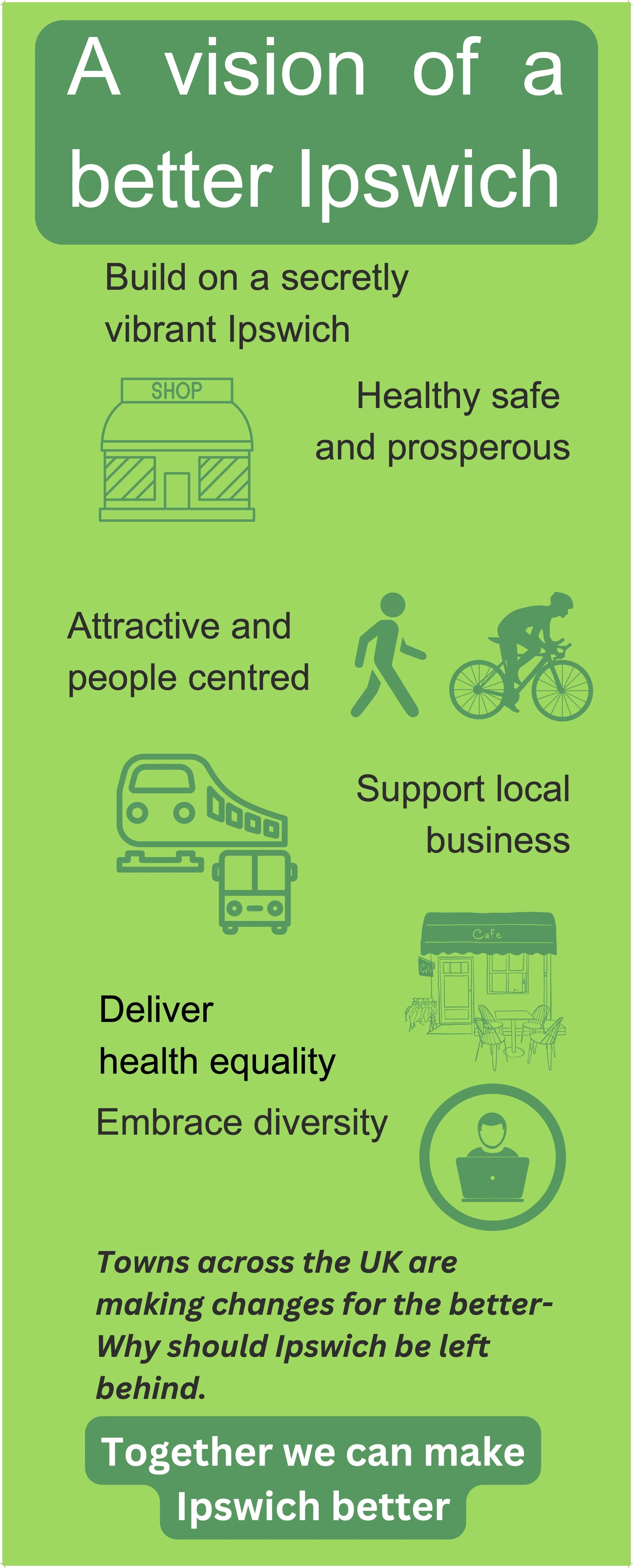 Ipswich to become a healthy, people-centred, thriving, and prosperous low pollution town where people feel safe to walk and cycle and our children can flourish. Where the way we live and work brings benefits to health and wellbeing, boosting the local economy, whilst curbing climate change and reducing health inequalities.